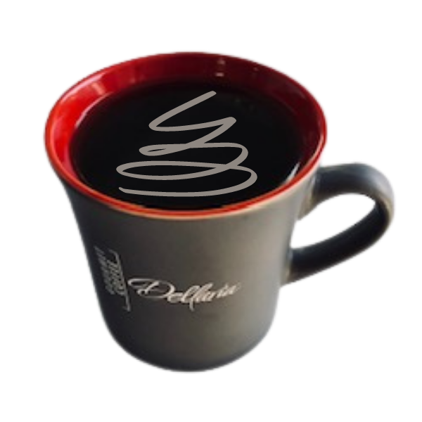 Set of two (2) coffee mugs. Two-tone chocolate outside, red inside with Dellaria’s Food logo.